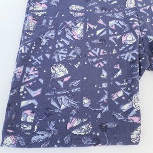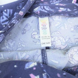 One size. Base color a periwinkle grey (that's my best color guess!). Accents are white, light purple, and light pink.
