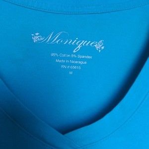 Classic cotton/spandex blend t-shirt in bright aquamarine. Features a v-neckline, cap sleeves, and very slight hi-lo hemline. The fabric is lightweight, stretchy, and very soft.