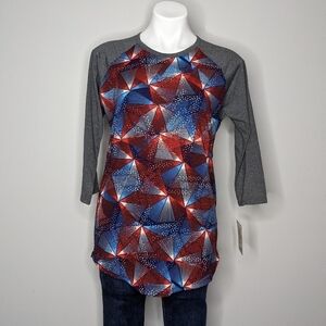 NWT LuLaRoe Randy grey red blue geometric patriotic baseball t-shirt M. Perfect for the 4th of July.