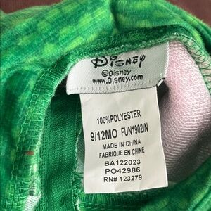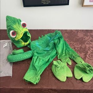 EUC. Pascal the chameleon from Disney’s Tangled movie. 3 Piece set. Zip up onesie long sleeve with tail, slippers, and head piece which has Velcro closure. 100% polyester. 9-12 months.
