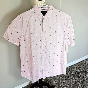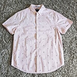 Collared button down white shirt, pink pinstripe with blue pineapple print