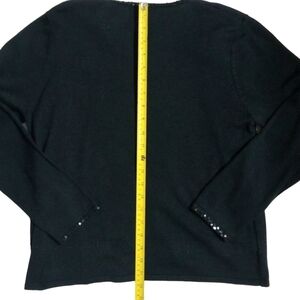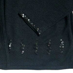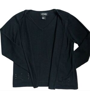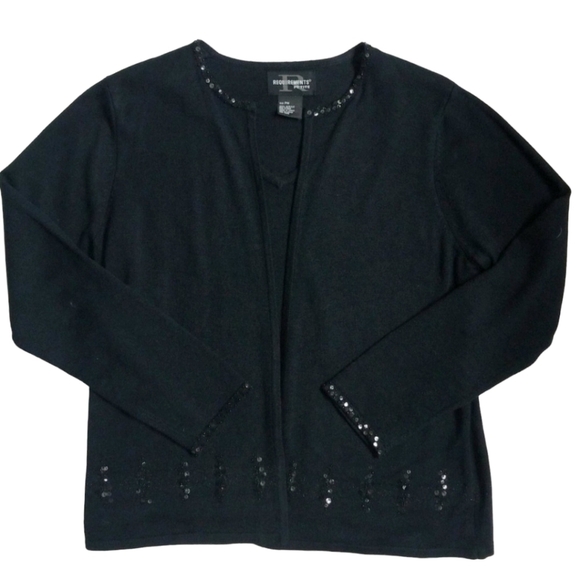 One piece, but looks like two. V-neck underneath with a cardigan cover. The top, bottom, and sleeve cuffs are sequenced. Great for the holiday! In very good condition.