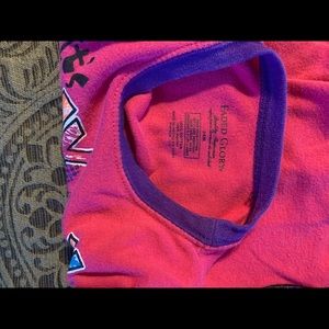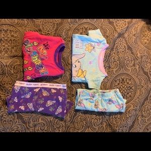 4 piece set of size 24 month girls toddler pajamas. One pair is Disney Baby. It’s is light blue in color with white stars and pink trim, and has Dumbo on it. Short sleeve top with long pant bottoms. The other set is by Faded Glory. It has a long sleeve top with long pants. Too is hot pink with purple trim and says “It’s My Birthday”. Pants are purple with cupcakes, butterflies, and “My Birthday” all over them. No rips, no tears, no stains. Smoke free home.