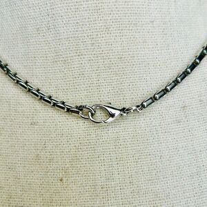 I believe this style is called an elongated box chain but please look closely as I may not be correct. Can be worn alone or with a pendant. Silver tone metal. Because of the weight I think it could be stainless steel. Looks brand new. Bright and shiny.