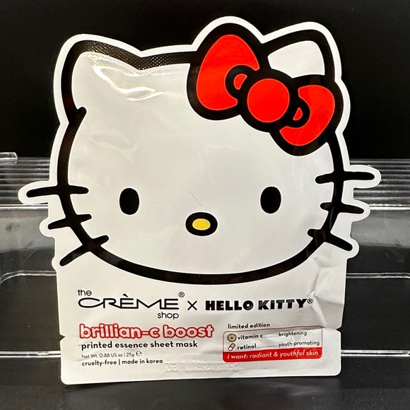 Revitalize your skin with The Crème Shop x Hello Kitty Brillian-C Boost Sheet Mask. Infused with vitamin C and retinol, this mask promotes youthful, radiant skin. The charming red and white Hello Kitty design adds a playful touch to your skincare routine.