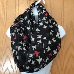 Amply sized OSFM infinity scarf featuring white and red birds flying against a black background. Measures 34-1/2 inches from fold to fold and 31 inches in depth. Easy-care polyester. A great addition to any outfit. Especially nice under a coat or jacket.