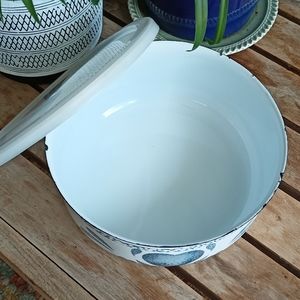 This vintage bowl with a lid (handy!!!) Reminds me a bit of the old Dutch Delfts Blauw and has a lovely boho and farmhouse look to it. The bowl was made in Thailand, and the lid has a metal rim. Definitely a vintage; you won't find this kind of closing mechanism anymore. Has some signs of wear, I tried showing it all on the pictures.