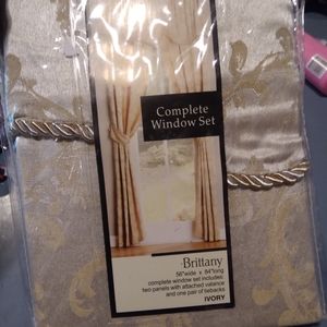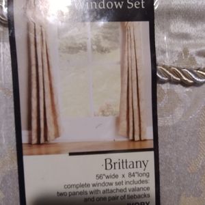 Complete Ivery Window set by Brittany. 56" wide x 84" long. Set includes Two Panels with attached valance and one pair tiebacks. Can be bundled with any other 3/$15 items in my shop! Just add to the bundle and send me a $15 offer!
