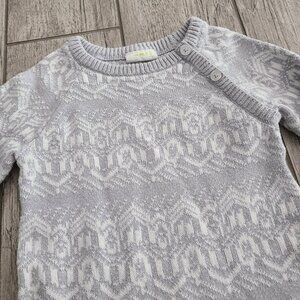 Adorable and cozy Crazy 8 sweater dress in a soft gray and white knit pattern. Features long sleeves, ribbed cuffs, and a button detail at the shoulder for easy dressing. Perfect for layering with tights or leggings during cooler weather. Stylish, comfortable, and ideal for school or family outings.