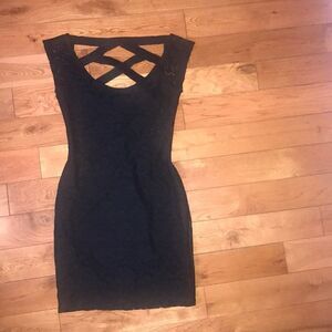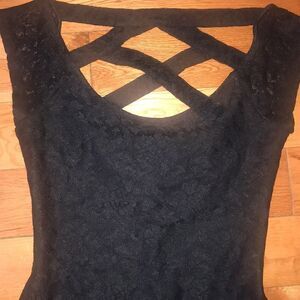 Nollie black fitted dress with lace overlay. Criss crosses back neckline.