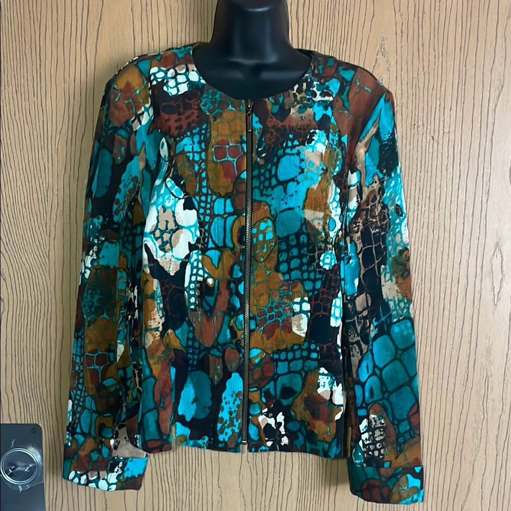Vibrant jacket with an abstract pattern. Features a mix of teal, brown, and black colors. Perfect for adding a pop of color to any outfit.