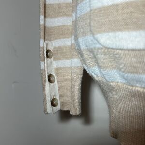 Overall, still in good condition. Some fuzz balls under the arms and some very light fuzzing of the material as shown in photos. Loft size small, lightweight sweater. Two pockets on the front. Buttons at the bottoms of the sleeves.