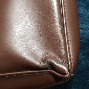 Small brown leather handbag with lots of space. Measurements are: L 7.5", H 7.5', D 6.5 and 13" shoulder strap . There are a couple of spots, show in pictures above