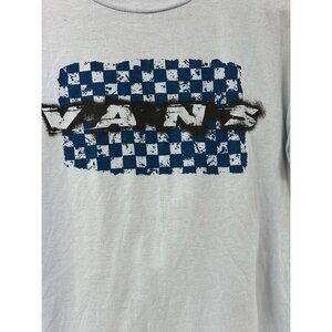 Show your style with the Vans Logo T-shirt in size Small. This white cotton tee features a distinctive blue checked design, perfect for casual or skate wear.