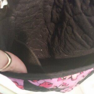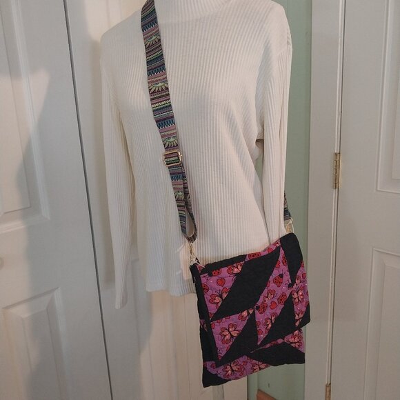 3184 Handmade Quilted Crossbody Bag with Guitar Strap. In Purple and Black. 9" X 11" great for shopping, washable.