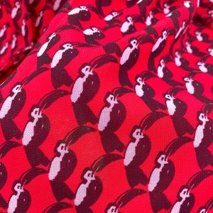 Bright tomato red with a super cute black and white toucan print/design. Long sleeved, balloon style.