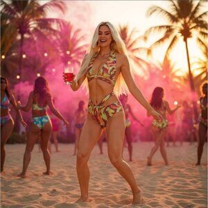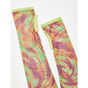 This Club Exx set features kaleidoscopic tie‑dye hot pants that sculpt w/ stretch & shimmer, paired w/ opera‑length fingerless gloves for futuristic edge.