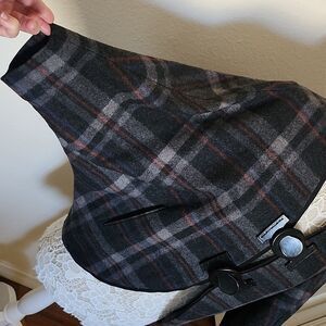Gorgeous plaid, with bat wings, leather "hook and eye" closure, two front pockets, fully lined, measuring 35" pit to pit, 22" at waist, and 26" in length. Based on measurements, I'm listing as a size large. EUC, with zero flaws! C1.9221