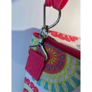 31 thirty one insulated picnic tote pink circles. 13"x11"x5". minor discoloration on the bottom. otherwise good used condition.