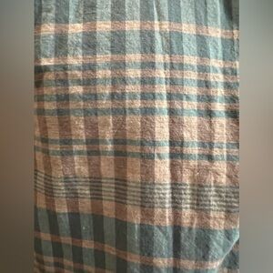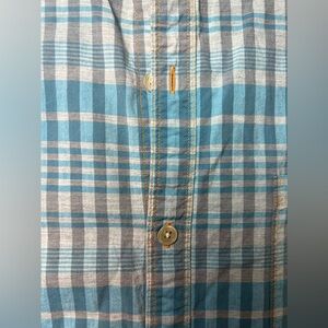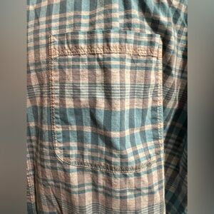 Men’s plaid, button up shirt. 7- button up front. 1- pocket on left chest. Short sleeves. Collared. Lightweight. Good used condition.