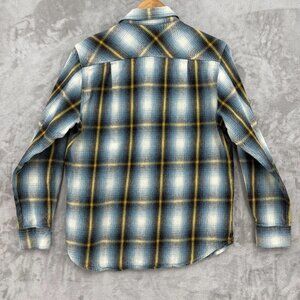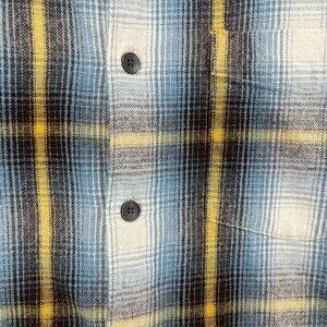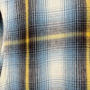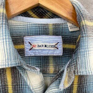 32 Bar Blues button front plaid flannel shirt in blue, brown, white & yellow shadow plaid. Material is 100% cotton. Size M. Please see photos for measurements.