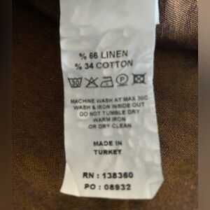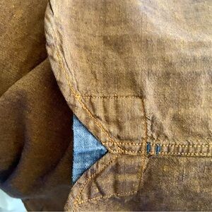 Stylish brown linen and cotton shirt with button-up design. Features a chest pocket and contrasting inner collar. Well made. Like new. Excellent condition. Smoke free clean home.