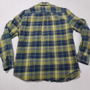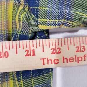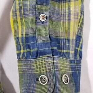 This is a colorful plaid cotton shirt by 32 Bar Blues in size L with a collared neckline and button closure. It features a woven fabric with long sleeves and contrasting trim. The shirt is suitable for travel, casual wear, and work, and it has a chest size of 44 inches. The design includes outdoor and classic themes, making it ideal for all seasons.