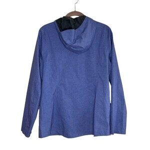 Pretty almost purpley blue with a heathered look. Lightweight. High neck zipper, drawstring hood, zip hand pockets. Approx measurements, 21” underarm to underarm, 25” long, 16” shoulders, 24.5” long. Gently worn.