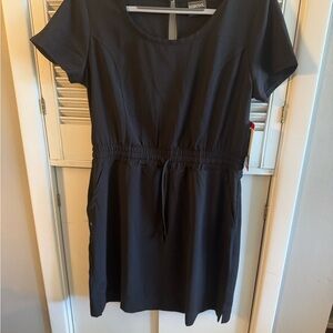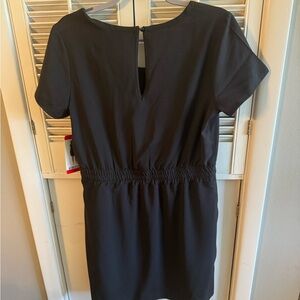 Chic black mini dress with short sleeves. Features a drawstring waist for a tailored fit. Perfect for casual outings.