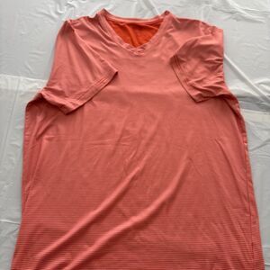 32 Degrees COOL Short Sleeve. Orange/White. Size Medium. Polyester 92% Spandex 8%. Approx. measurements: pit to pit 21", shoulder to bottom 28". Excellent preowned condition. No flaws, rips, stains.