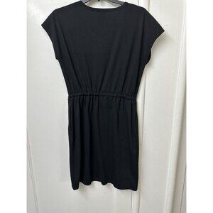 The 32 Degrees Cool Soft Lux Dress in size M is a black polyester blend dress with a drawstring waist, suitable for outdoor activities like hiking. This knee-length dress features short cap sleeves, a V-neckline, and a solid pattern. It is designed for travel and casual occasions, with a lightweight, stretchy material that is easy to care for with machine washable instructions. The dress embodies a sporty and active theme, perfect for the summer, fall, and spring seasons. Made by the brand 32 Degrees, this T-shirt dress has a drop shoulder style and a logo accent.