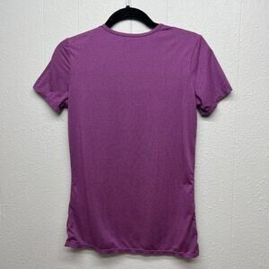 32 women's blue purple activewear top. Round neck. Short sleeves. Fitted. Stretch and soft material. In good used condition. No stains, tears or holes.