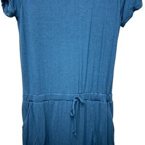 32 Degrees Cool women's pullover blue dress. Scoop neck. Short sleeves. Elastic waist with drawstring. Side pockets. Unlined. Stretch. Midi length. In good used condition. No stains, tears or holes.