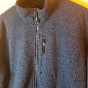Comfortable and cozy fleece zip up sweater. High neck, left side chest zipper pocket and side pockets as well. Navy blue and black lining. Excellent- like new condition.