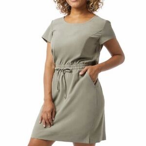 Stylish olive green dress with short sleeves. Features a cinched waist and tie detail. Perfect for casual outings.