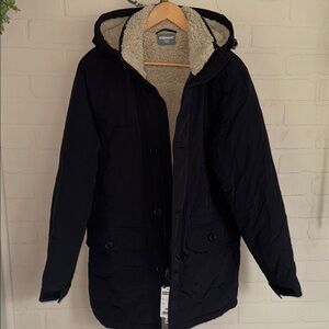 Warm and stylish puffer coat with hood. Ideal for cold weather.