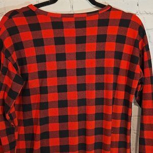 In good used condition overall wear no flaws. Red and black buffalo check with long sleeves and 3 button v neck