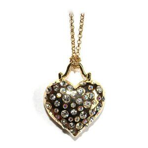 This is a gorgeous necklace measuring 32" long on a dainty chain link chain in gold. The heart charm is 1 1/2 inches in diameter. The front portion is decorated in aurora borealis crystal in a random pattern. The backside features small heart cutouts throughout. A great addition to your wardrobe and conversation piece of God's love!