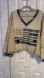 Stylish women's top featuring a unique patchwork design in beige and blue with flag and stud detail. Perfect for casual outings.