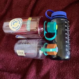 32 ounce Nalgene Water Bottle Bundle of 3, one wide mouth, one narrow mouth 32 oz, one narrow mouth 16 oz- clear, pink with teal top, and clear with blue top