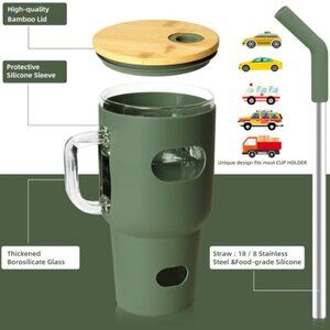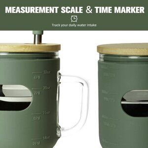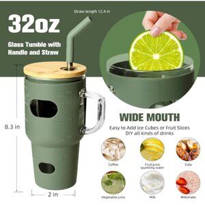 Qkelim: 32 oz - Glass Tumbler w/ Handle, Bamboo Lid - Silicone Sleeve w/ Measurement Scale & Time Marker - Wide Stainless Straw Ideal for Milkshake, Smoothie & Boba Juice (Olive Green)