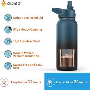 INSULATED WATER BOTTLE: Featuring advanced vacuum insulation technology, 32 oz water bottle keeps your drink HOT for 12 hours and COLD for up to 24 hours, allowing you to enjoy icy cold drinks after intense workouts or hot coffee while winter camping