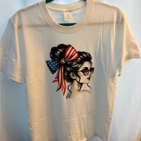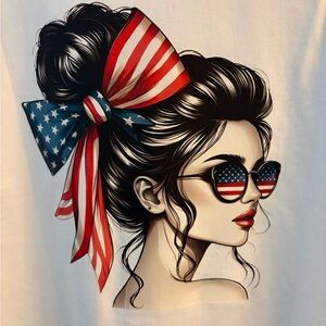 Stylish graphic tee featuring a woman with sunglasses and a bow in American flag colors. Perfect for casual wear.