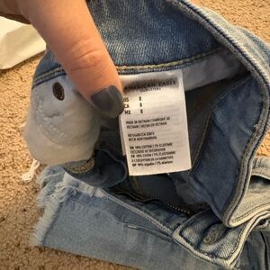 Stylish light blue jean shorts with a ripped design. Ideal for casual wear.