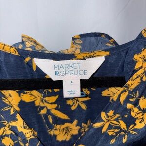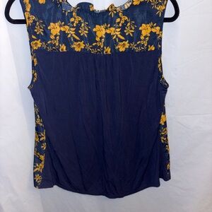 Chic sleeveless blouse with floral design. Navy base with vibrant yellow flowers. Ideal for casual or dressy occasions.