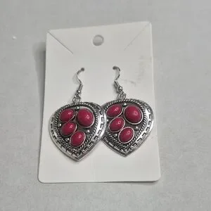 Stylish silver-tone heart drop earrings featuring glossy red cabochon accents. Lightweight and comfortable for daily wear. Pink color adds a feminine pop to any outfit. Silver-tone metal complements the vibrant pink stones. NWOT