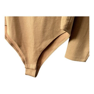 About Item: New tan ribbed bodysuit (some photos show it being yellowish but it is a creamy tan color). Super soft. Slim fit to hug your curves. 2 snaps at crotch for closure, long sleeves, square neck.