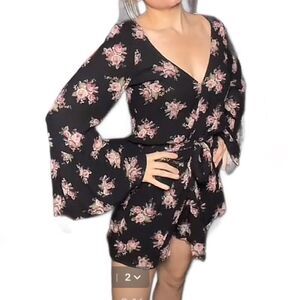 3/$20 American Eagle Black Floral Romper w/Long Bell Sleeve & Deep V-Neck (XXS)