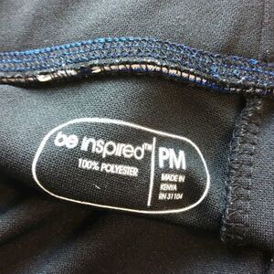 Be inspired black and blue yoga pants with drawstring waist. Pants have two or three , barely noticeable, very small, pulls ( couldn't capture with camera), and some very mild ( looks like lint) paint splatter please refer to pictures 6, and 7.