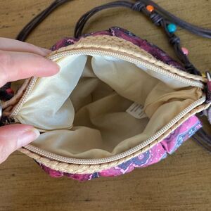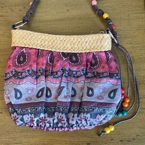 Small crossbody purse with boho floral paisley pattern in magenta and gray with a hint of silver sparkle, featuring zipper closure, braided straw trim, and brown cord strap with beaded details. In great condition!